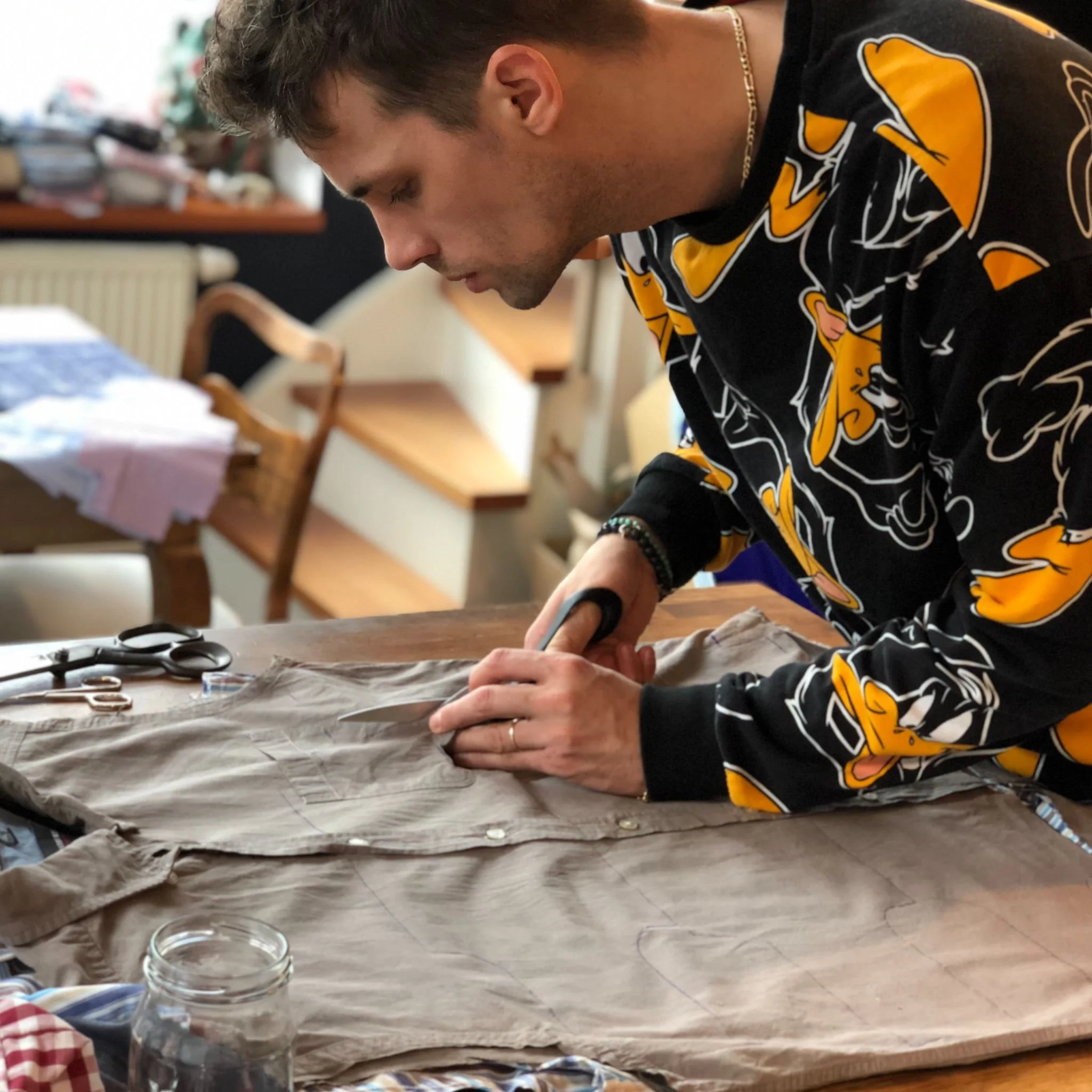 Je to fešák. Miluje barvy, koně, muzikály. Taky skvěle tančí a nezkazí žádnou legraci. O vysoké míře jeho kreativity svědčí nejen oblečení, které sám nosí, ale také to, které vyrábí. S takzvaným upcyclingem začal dříve, než toto slovo přišlo v Čechách do módy. Prvním impulsem byly džíny a pánské košile. Oboje jednou doslouží nebo vyjde z módy. Ale nemusí. Jedná se o kvalitní materiály, stačí se zamyslet, stříhat a přetvořit. První výrobky byly tašky a batohy. Nutno dodat, že Laco není vystudovaný krejčí, ale báječný samouk. Další důkaz, že prvním krokem je vždy odvaha, láska, víra. Tak vznikla značka VecizVeci /Věci z věcí/.